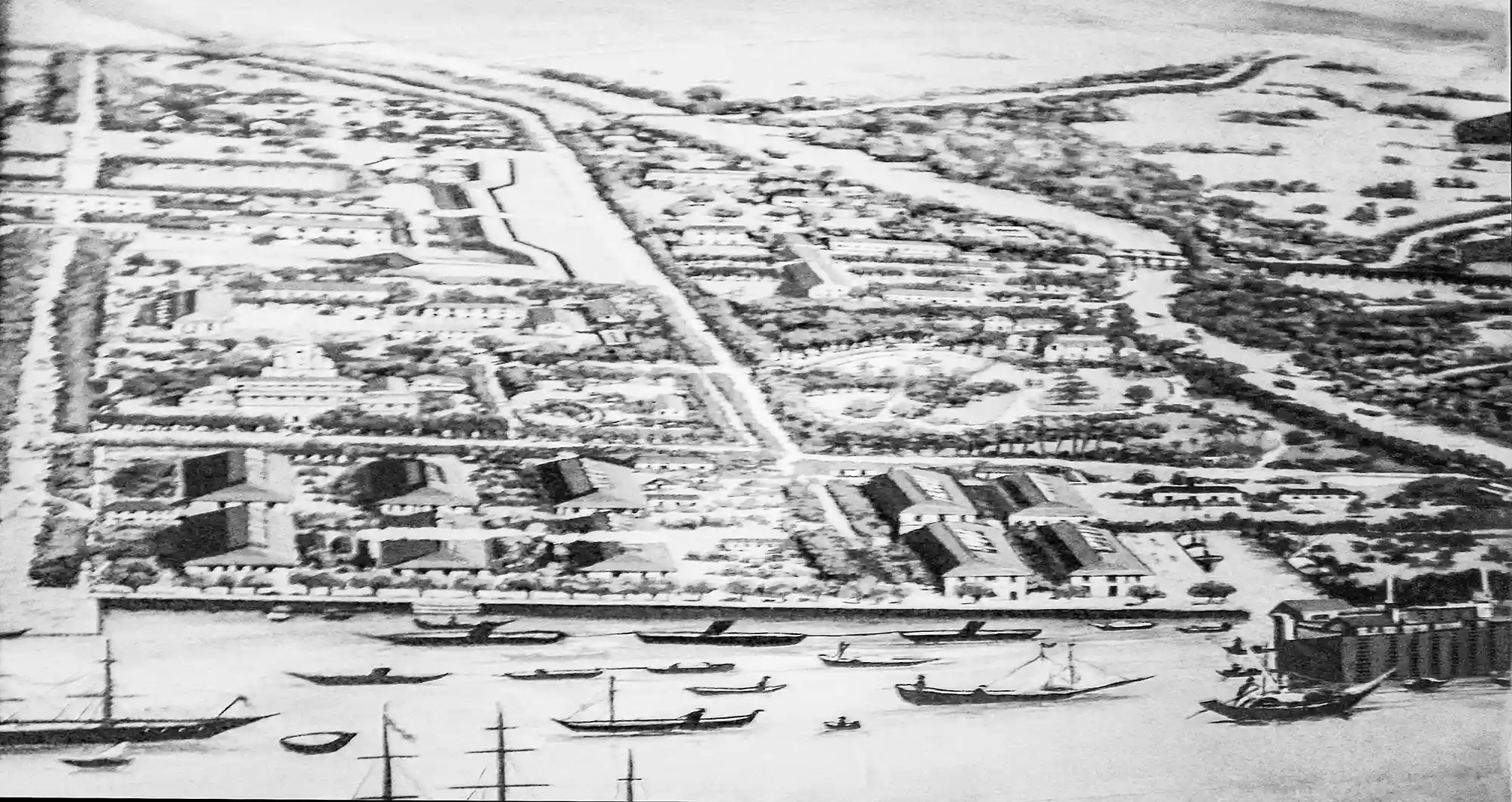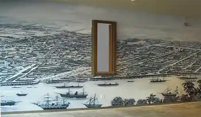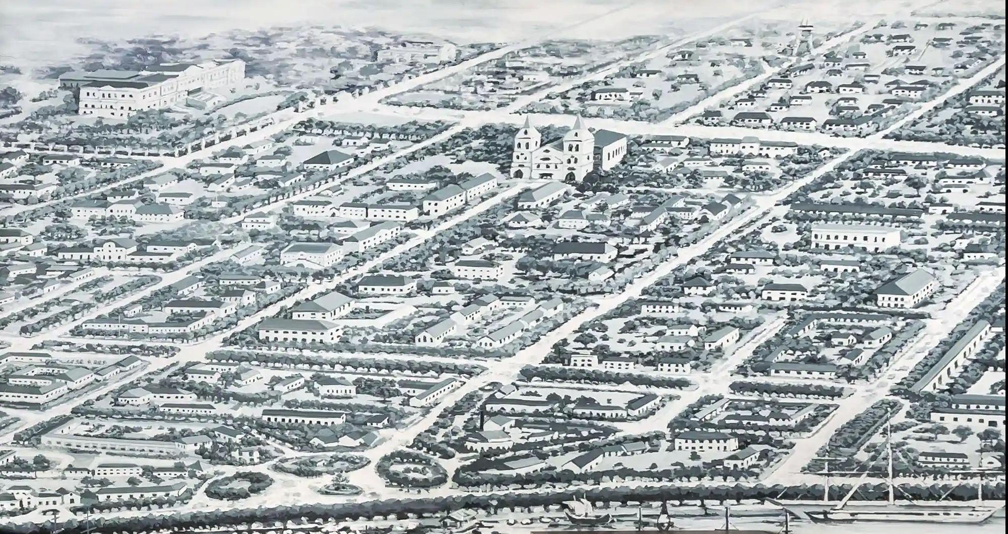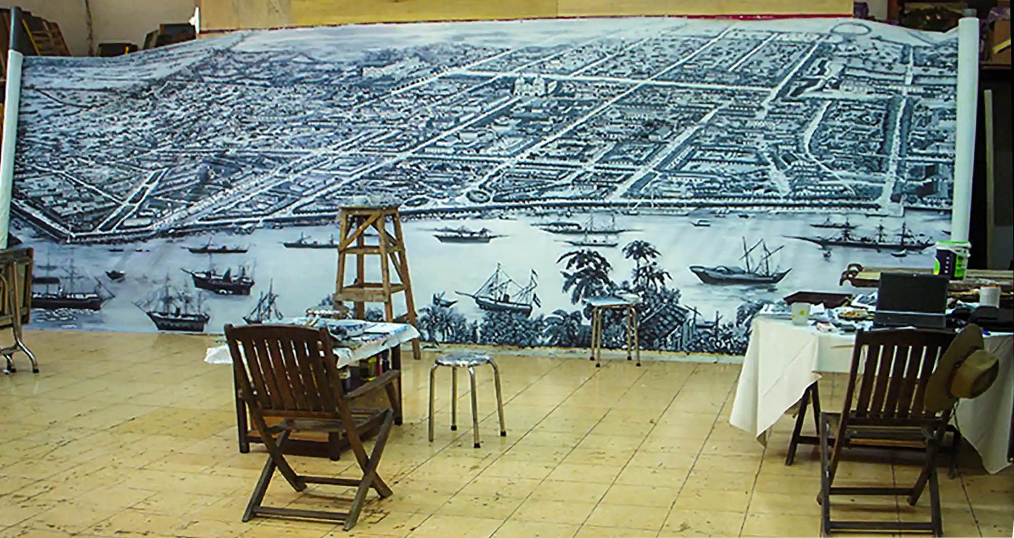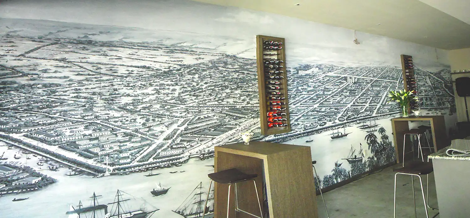 Used as a background painting on the walls of a fusion restaurant in Ho Chi Minh City, this 35m2 mural is inspired by a view of Saigon drawn in 1881.